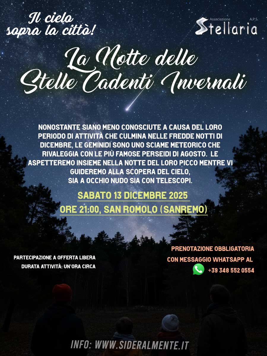Ore 21 - secondo appuntamento della rassegna "Le Stelle sopra la città", nella notte di massima attività delle meteore Geminidi, che insieme alle Perseidi di Agosto offrono uno dei migliori momenti dell'anno per ammirare le stelle cadenti! Prenotazione obbligatoria con messaggio WhatsApp al +39 348 552 0554 o cliccando qui https://wa.link/y48edj - Offerta libera.
